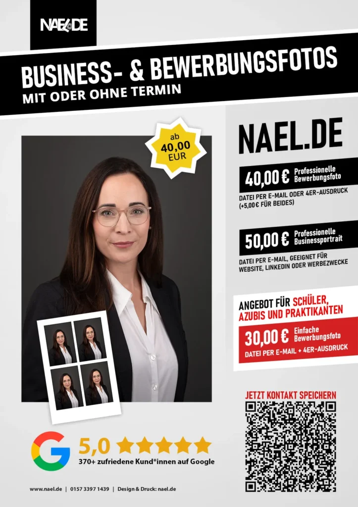 Bei Nael Fotostudio erstellen wir hochwertige Bewerbungsfotos und Business-Portraits, die genau auf Ihre Wünsche und den vorgesehenen Zweck abgestimmt sind. Ob klassisches Bewerbungsfoto, modernes Business-Portrait oder kreatives Branding-Foto, wir gestalten jedes Bild individuell.